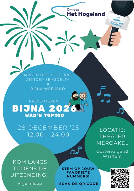 Omroep Het Hogeland en Omroep Eemsdelta presenteren met de mannen van Bijna Weekend de ‘Bijna 2026 – Wad’n Top 100′ live vanuit Theater Meroakel in Warffum op zondag 28 december 2025 tussen 12 uur ’s middags en 12 uur ’s nachts.