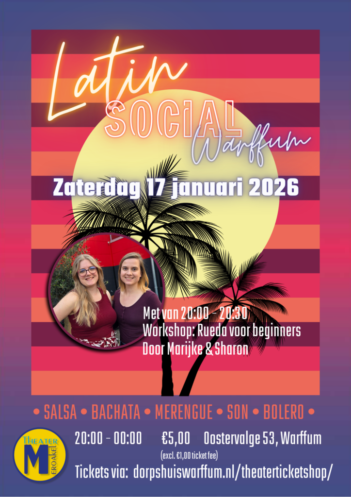 Op zaterdag 17 januari 2026 verandert theater Meroakel in Warffum in een bruisend stukje Latijns-Amerika. Tijdens Latin Social Warffum geniet je van een heerlijk Latin dansfeest met de lekkerste salsa, afgewisseld met bachata, merengue, son en bolero. Of je nu komt om te dansen of gewoon te genieten van de sfeer, dit wil je niet missen!